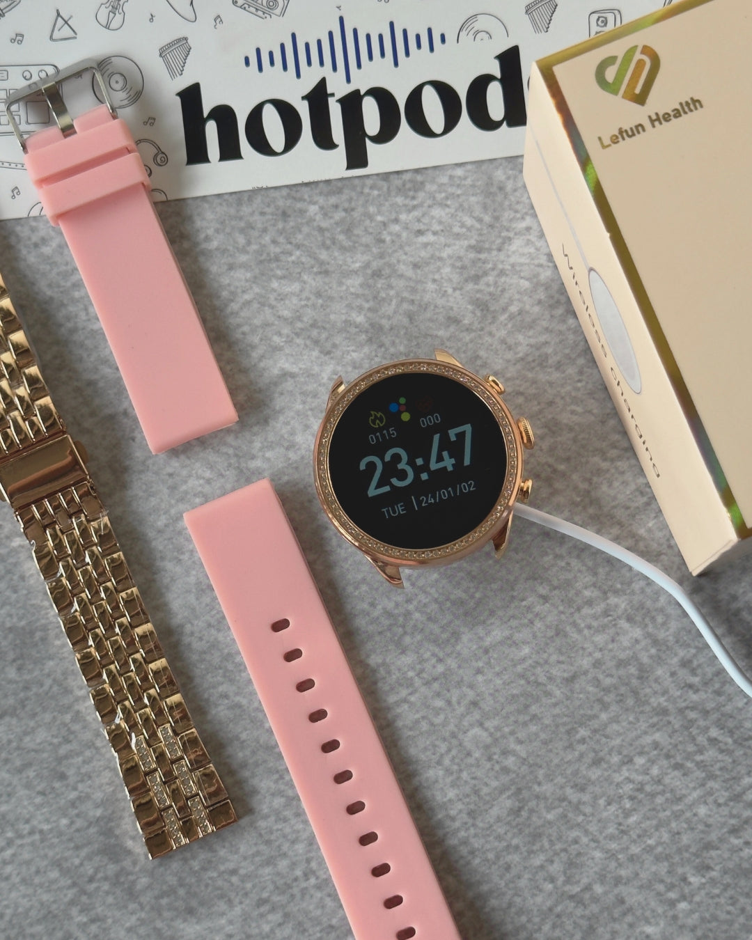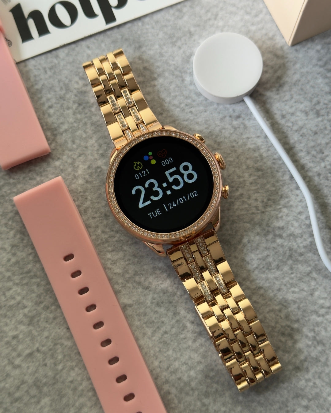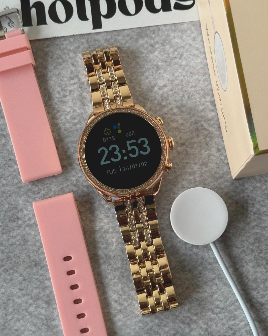 | Package Contents | 1 Watch, 1 Silicone Strap, 1 Mertal Strap, Wireless Charger, Manual, Box |